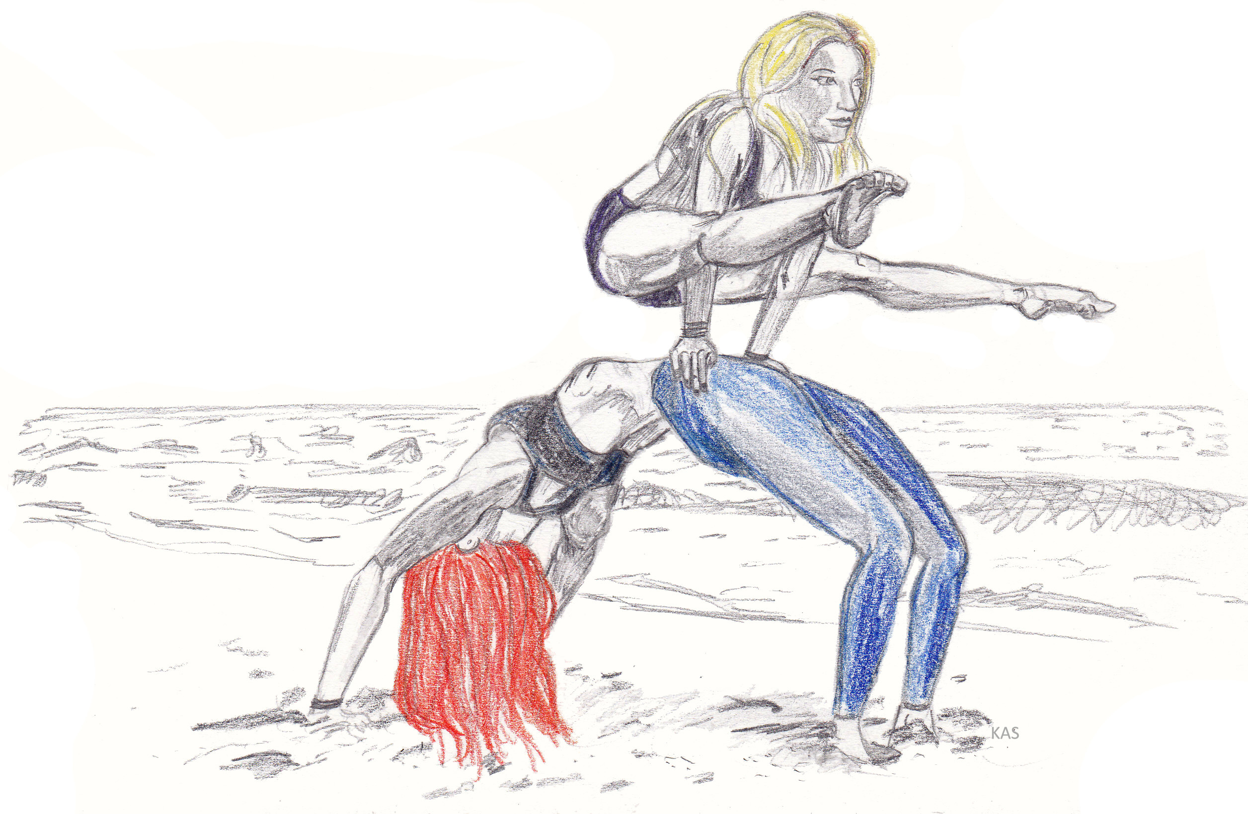 Color pencil drawing of two women doing acro yoga by the beach.
