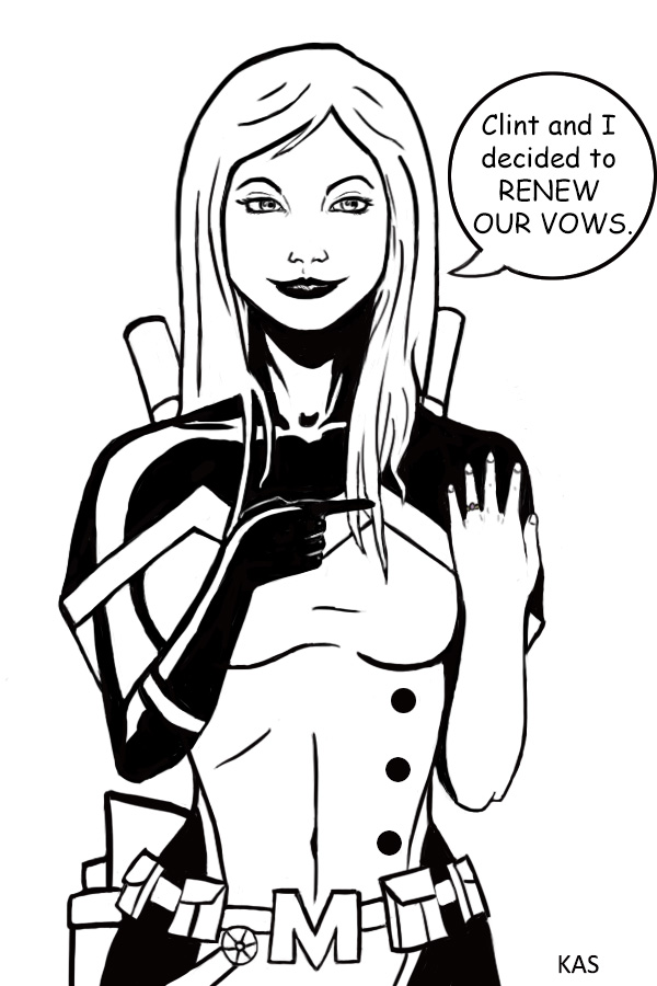 Digital illustration of Bobbi Morse, Mockingbird saying she and Clint "Renewed Their vows." in contrast to fans wanting Peter Parker and MJ back together,